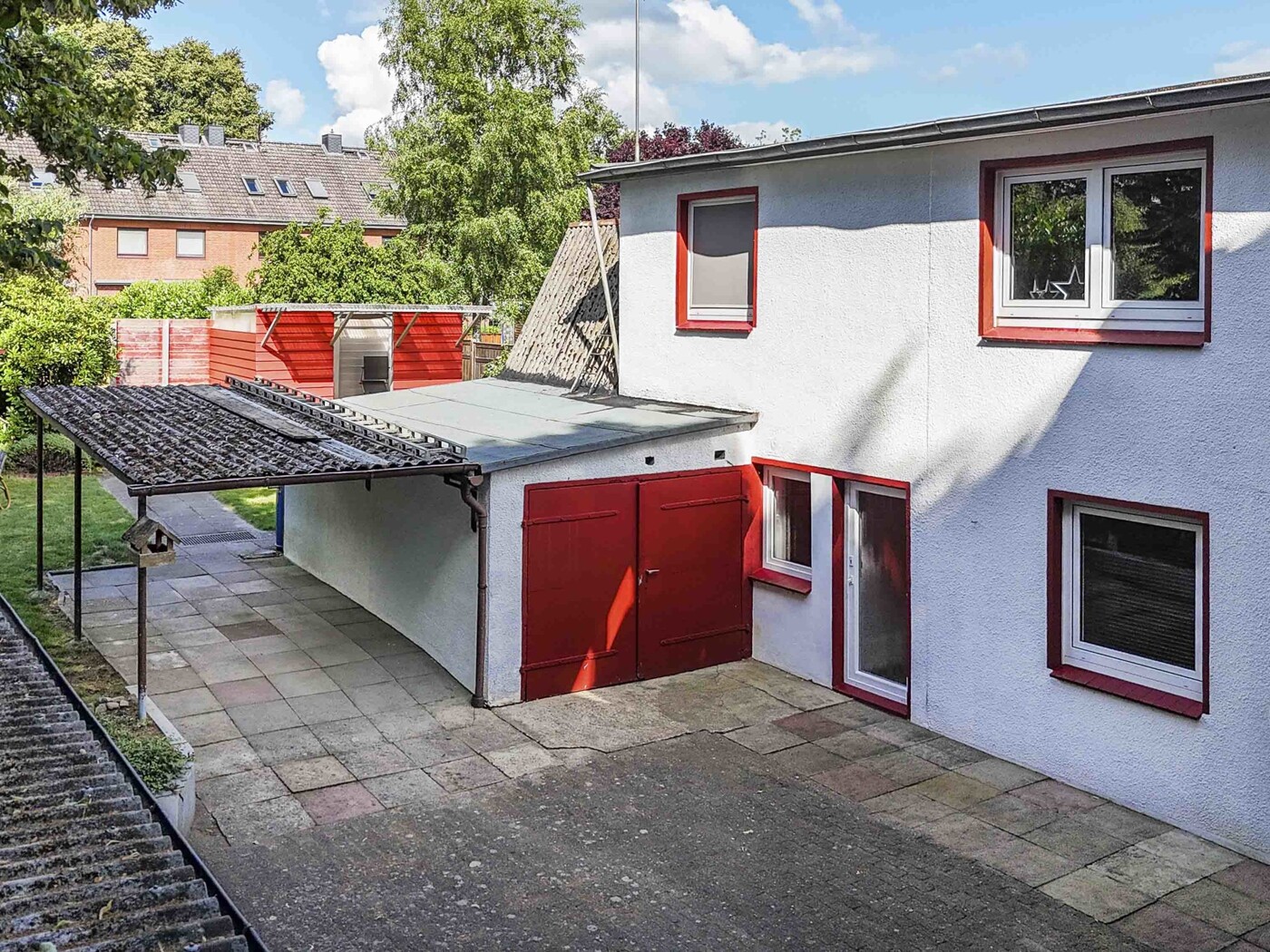 Von der Auffahrt führt ein Tor in den Innenhof mit Platz für mehrere Fahrzeuge. Dort befinden sich eine zur Hobbyfläche umgebaute Garage, ein Carport und zusätzliche Stellplätze – ideal für Familien mit mehreren Autos oder Besuch.